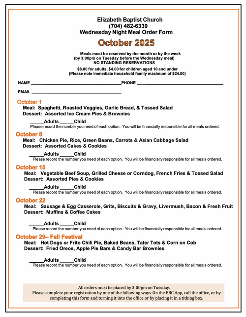 Orders can be made monthly or weekly by calling the church office or by filling out the online form located in the link below, the EBC App, or completing the Wednesday Night Meal Order form and place in the tithe box.